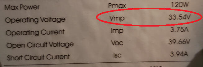 - Check the label on the back of your panel and find the voltage rating (usually marked ‘Vmp’ or ‘Vpmax’).