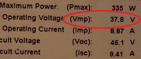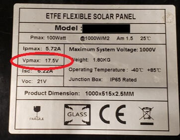 - Check the label on the back of your panel and find the voltage rating (usually marked ‘Vmp’ or ‘Vpmax’).